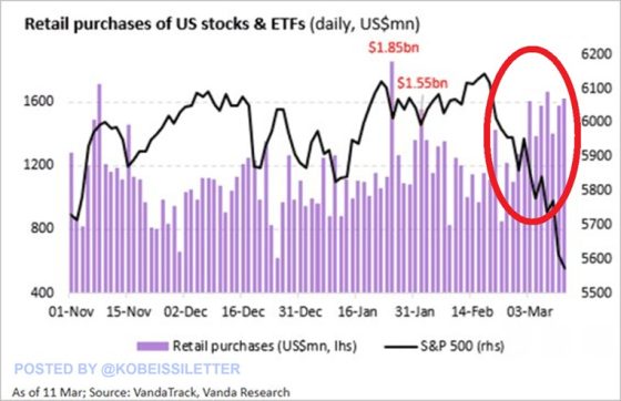Tutti fessi? E a chi hanno venduto? Ai bag holders, come viene chiamato in gergo il parco buoi. Quelli che portano i bagagli, quelli che si accollano i pesi di mercato. Di fatto, la clientela retail. Che, di converso, nel medesimo arco temporale ha toccato livelli record di acquisti di titoli azionari. Risultato? Ha preso in pieno il treno in corsa della mega-correzione delle ultime settimane.