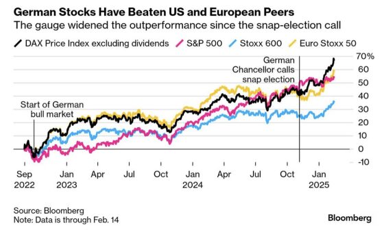 Il primo è contenuto in questo grafico, il quale mostra come l’indice di riferimento tedesco, il Dax, arrivi all’appuntamento con le urne addirittura in over-performance sui due benchmark europei, Euro Stoxx 50 e Stoxx 600. E, cosa decisamente più interessante, dal momento dell’annuncio del voto anticipato, l’indice di Francoforte ha battuto anche lo Standard&Poor’s 500. Insomma, meglio della tanto declamata Wall Street.