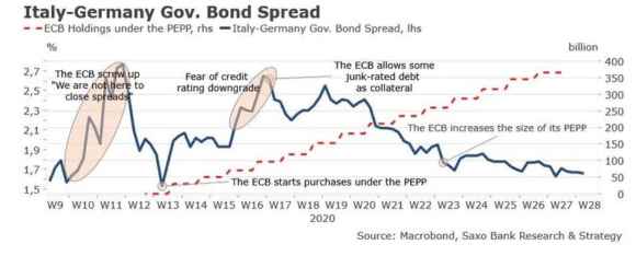 Questo articolo è stato scritto prima che la Bce comunicasse le sue decisioni e prima della conferenza stampa di Christine Lagarde. Volutamente. E come sorta di stress test. Ovviamente, la mia decisione è stata influenzata anche dal fatto che nessuno prevedesse annunci particolarmente significativi da parte della Banca centrale, dopo il diluvio di liquidità messo in circolo e la messe di acquisti obbligazionari già compiuti. Ma c’è dell’altro. E sta tutto nei tre grafici più sotto, capaci più di mille annunci di tratteggiare i risultati ottenuti finora dall’Eurotower con il suo intervento senza precedenti. Primo, come ormai ammettono anche i muri, compito principale della Bce è stato finora quello di calmierare artificialmente lo spread italiano, colmare il gap strutturale fra Btp e Bund. Insomma, agire al di là del proprio mandato. Ma si sa, c’è il Covid. E poi a Karlsruhe sono antipatici. Secondo, la Bce – esattamente come la Fed – sta garantendo linee di credito extra-bancario al ramo corporate europeo, tramite l’acquisto indiscriminato di obbligazioni, alla faccia del rating. Insomma, non solo ha riempito le casse della banche con un’iniezione di liquidità monstre attraverso l’ultima asta Tltro, ma, tanto per gradire, la scorsa settimana ha fatto toccare al suo programma di acquisto corporate (Cspp), il record in controvalore drenato dal mercato. Parliamo di qualcosa come 3,3 miliardi di euro, 400 milioni più del record precedente. Signori, significa disperazione. Significa acquisti a strascico nella speranza che la gran parte della tonnara finisca nella rete, pur sapendo benissimo che saranno in molti a restarne fuori.