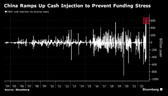 La scorsa settimana, in piena pantomima globale da rialzo dei tassi, la Banca centrale cinese ha iniettato nel sistema 835 miliardi di yuan (121 miliardi di dollari) in contratti reverse-repo a 7 giorni. Di fatto, alla luce del netting, qualcosa come 632 miliardi di yuan messi in circolazione, la più ampia iniezione su base quotidiana addirittura dal 2004.