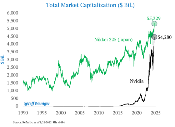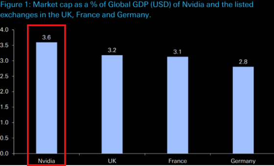 Non solo il market cap di Nvidia oggi è pari al 3,6% del Pil mondiale ed è superiore a quello dei mercati azionari di Francia, Germania e Regno Unito, ma con i 4,28 trilioni raggiunti dopo l’ultimo strappo di venerdì, oggi è a poco più di 1 trilione di distanza dalla capitalizzazione del Nikkei 225. Il secondo mercato azionario del mondo dopo Wall Street.
