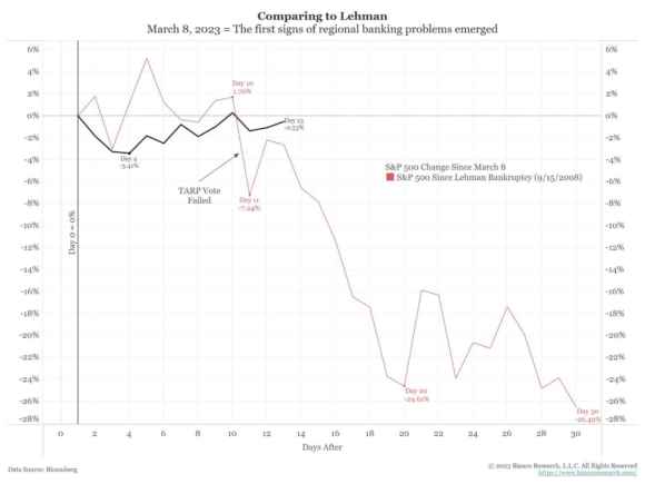 Insomma, siamo o no di fronte a un altro 2008? Le differenze ci sono. E non da poco. Il fatto però che Bloomberg si sia sentita in dovere di comparare la reazione dello Standard&Poor’s 500 dopo il crollo Lehman e quello di Silicon Valley Bank probabilmente significa qualcosa di più di approccio social alla vicenda.