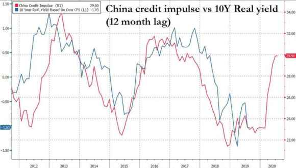 Qualcosa non ha funzionato. O la Cina ha mentito sui dati della ripresa oppure, vista anche l’altissima percentuale che la voce di emissione di debito sovrano rappresenta sul totale, Pechino sta operando a sua volta in modalità Qe, pur non volendolo ammettere. Qual è il problema, la correlazione diretta con le scelte della Fed? Lo mostra questo ultimo grafico, dal quale si evince come storicamente l’aumento della liquidità iniettata nel sistema dalla Pboc cinese e il conseguente aumento dello shadow banking portino con sé una crescita a 12 mesi dei tassi reali sul Treasury decennale statunitense, il benchmark del mondo.