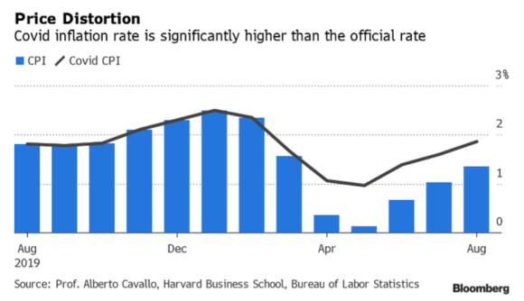 In parte sì, come conferma lo stop per tutto il mese di agosto all’acquisto di Etf. Tradotto, sospensione del sostegno diretto all’obbligazionario corporate Usa dopo mesi di acquisti senza vincolo di mandato rispetto al rating sul collaterale. Ma non solo. E la conferma, alla vigilia del board che si conclude oggi, arriva da fonte più che autorevole: il National Bureau of Economic Research. Il cui ultimo paper di studio, intitolato Inflation with Covid consumption baskets e curato dal professor Albert Cavallo della Harvard Business School, mostra un’evidenza molto allarmante, come riportato anche da questo grafico.