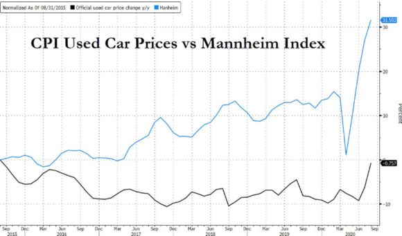 E quest’altro grafico mostra come non serva abbeverarsi alla fonte di saggezza di un accademico di Harvard per cogliere ciò che si vuole a tutti i costi negare, poiché strumentale alla vulgata criminale del debito buono e che non fa danni: uno dei proxy più chirurgici al riguardo negli Usa è dato dal prezzo delle automobili usate e il balzo conosciuto nel mese di agosto non necessita di particolari commenti. Se non che, anche in questo caso, realtà narrata e realtà vera paiono posizionate ulteriormente agli antipodi: se infatti l’aumento appare netto già nella tracciatura ufficiale del CPI report (linea nera), quello registrato da un leader del settore dell’aste di veicoli usati come Mannheim di Atlanta (linea azzurra) appare decisamente più drastico. E preoccupante.