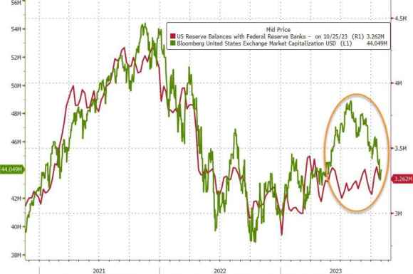 E il secondo grafico è ancora più interessante, poiché mostra come i tonfi equities che i botti mediorientali hanno silenziato a livello di percezione mediatica, abbiano consentito il ritorno di una correlazione storica di equilibrio del mercato. Quella fra capitalizzazione del mercato azionario Usa e riserve bancarie parcheggiate presso la Fed. Una multi-year relationship che proprio a inizio 2023 aveva cominciato a innescare un decoupling divenuto sempre più ampio. Scostamenti tellurici impercettibili al suolo. Ma che in profondità scavano assetti.