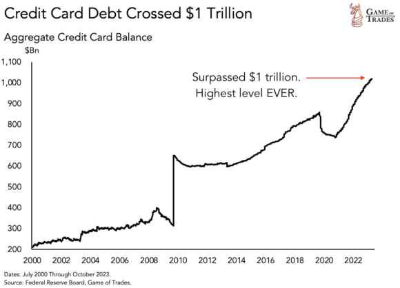 La ragione? La mostra plasticamente quest’altro grafico: sempre negli Usa, il debito cumulativo su carte di credito ha appena superato la quota record assoluto di 1 trilione di dollari. Tradotto, insostenibilità totale con tassi di interesse che sull’indebitamento retail sono oggi ben oltre il 20%. E stante un livello di risparmio da pandemia ormai bruciato, l’alternativa a un nuovo ciclo di stimmie money è quella della rivolta sociale. E non di qualche fanatico. Di Mr. Smith, il cittadino modello con villetta unifamiliare e raccoglitore dove tiene le ricevute delle tasse e delle multe per divieto di sosta diligentemente pagate.