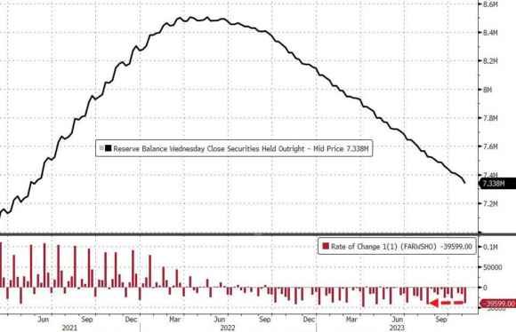 La crisi servono. Lo dimostrano questi altri due grafici. Dai quali si scopre che il caos innescato dal combinato Fed-Hamas sul mercato obbligazionario ha permesso alla medesima Banca centrale Usa di dar vita al dimagrimento più drastico del suo stato patrimoniale dalla metà dello scorso agosto: un Qt da 39,6 miliardi di dollari in un solo colpo. D’altronde, questo è il tempo del cambio di stagione. E come occorre fare spazio negli armadi, persino i bilanci della Banca centrali non sono illimitati nella loro capacità di stoccare assets. Dopo un po’, bye bye.
