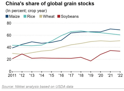 Il grafico qui sopra mette la questione in prospettiva: stando a dati tracciati da un attento e interessato osservatore delle mosse strategiche cinesi, ovvero lo U.S. Department of Agriculture, scopriamo che la Cina oggi possiede circa il 69% di tutte le riserve mondiali di mai, il 60% di quelle di riso e il 51% di grano. E quest’altro grafico mostra ancora di più.