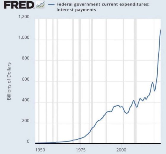 Ma guarda un po’, probabilmente per una volta il sottoscritto ci aveva visto lungo. Ma come mai questo cambio repentino? Certo, il fatto che la Fed abbia tagliato i tassi di 50 punti base e come risposta dal mercato abbia ottenuto un’esplosione dei rendimenti obbligazionari può aver garantito benzina sul fuoco di una narrativa un pochino differente da quella ufficiale. Ad esempio, questo grafico ci dice che l’America che si sta avvicinando al voto oggi veda il 23% di tutte le sue entrate fiscali impegnate nel mero pagamento di interessi sul debito. Qualcosa come 1,2 trilioni l’anno su uno stock totale ormai di 36 trilioni.