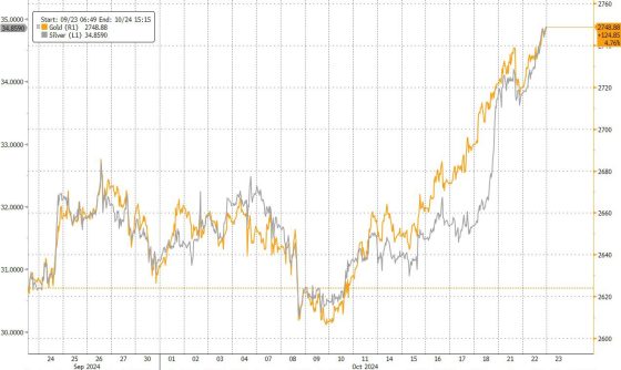 Guardate questo grafico, aggiornato nei suoi dati alla chiusura di contrattazioni di martedì sera: più si avvicina il voto Usa, più il redde rationem con l’eredità reale della Bidenomics diviene improrogabile e più i beni rifugio che schermano da indebitamento come premio di rischio e inflazione come tassa silente e invisibile, divengono players assoluti.