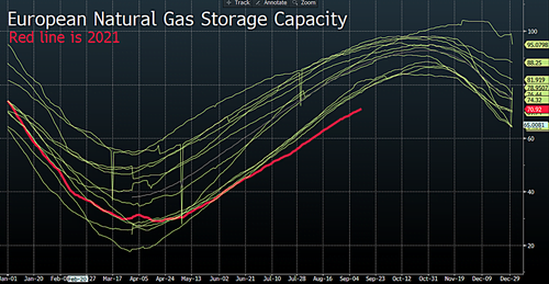 A Bruxelles possiamo contare su una quarantina di potenziali premi Nobel e non lo sapevamo. Come non riconoscere, infatti, il genio che alberga in chi decide proprio ora – alla vigilia dell’autunno, con le bollette energetiche già alle stelle, Nord Stream 2 appena completato e pronto all’operatività dal 1 ottobre e le riserve di gas europee sotto la media a 5 anni, come mostra il grafico – di aprire un bello scontro frontale con Gazprom (e, quindi, con il Cremlino)?