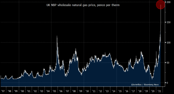 Perché signori, vi pare altresì un caso che proprio l’altro giorno la Corte europea per i Diritti dell’uomo di Strasburgo abbia sentenziato la responsabilità diretta della Russia nell’avvelenamento mortale di Aleksandr Litvinenko e in quello dell’altra ex spia del Kgb, Sergej Skripal, salvatosi miracolosamente? Oltretutto, avvenuti entrambi su territorio britannico, altra nazione che – in quanto ad atteggiamento pregiudizialmente anti-russo – regala enormi soddisfazioni a Washington. Oggi, poi, fresca di accordo trilaterale con l’Australia per contrastare la Cina (auguroni e preparate parecchie bodybags, in caso vi salti in testa qualche alzata d’ingegno stile Falklands su Taiwan), chissà quale stato di eccitazione anti-comunista pervade Downing Street. E per una ragione molto chiara e di stringente interesse interno, come mostra questo grafico: con il prezzo della bolletta al record assoluto per il cittadino britannico e molti piccoli fornitori che dal 21 settembre hanno smesso di accettare nuovi clienti, il buon Boris Johnson necessita di un capro espiatorio come dell’aria che respira. Et voilà, i russi cattivi che oltre ad avvelenare la gente, la fanno anche dissanguare con il prezzo dell’energia e magari morire di freddo, come ai tempi dei confinamenti in Siberia.
