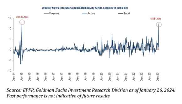Ecco perché Evergrande, come il Romeo del film, deve morire. Per salvare l’intero Sistema e i suoi semestri di retorica da rally azionari e soft landing. Ora popcorn per tutti, va in onda la March madness statunitense fra drenaggio a zero della facility reverse repo e chiusura l’11 marzo del fondo di sostegno bancario della Fed, l’ormai mitico Btfp. Con i suoi 170 miliardi di utilizzo settimanale, necessari solo per permettere alle filiali di alzare la saracinesca e accendere i pc. Ma questa storia ci insegna altro. Anzi, ci conferma come i media italiani abbiano una particolarità. Sposano una causa per settimane, unicamente per ragioni ideologiche e di schieramento. Un bombardamento. Poi, di colpo, si disinnamorano. E come gli amanti traditi, scatta l’indifferenza. Proprio quando, finalmente, qualcosa di concreto si stagliava all’orizzonte. Non ci ricorda il mantra del mitologico default di Evergrande, annunciato per semestri a giorni alterni nell’inverno del 2023? Ovviamente, nulla è accaduto. Almeno fino a quando Xi non ha deciso. In compenso, date un’occhiata a questi altri due grafici: dopo settimane di bagni di sangue, talmente emorragici da rendere apparentemente inutili tutti gli sforzi dei regolatori (divieto di short selling, taglio dei requisiti fino al fondo salva-equity da 280 miliardi), ecco che di colpo l’Etf che traccia le large-caps del Dragone registra un’alluvione di call. Mentre gli equity funds cinesi hanno appena festeggiato il secondo più grande inflow settimanale di sempre, 12 miliardi di dollari.