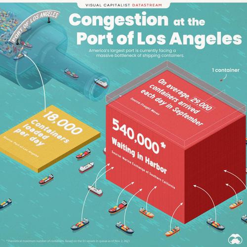 E tanto per capire in quali condizioni sia il mondo, ecco che questi altri due grafici mettono in prospettiva la dinamica dei colli di bottiglia ancora presenti sulla supply chain globale: non solo lo spread fra prezzi alla produzione e tempi di consegna dei fornitori ha appena raggiunto il suo massimo storico da quando viene tracciato il dato, sintomo di una tensione nel comparto che richiederà trimestri e non settimane per normalizzarsi, ma ecco che quei fenomeni del datastream di Visual Capitalist hanno deciso di chiarificare per bene le idee a tutti, utilizzando non i diagrammi ma le proporzioni in un rendering. Il tutto per mostrare quale sia il grado di congestione attualmente in atto al porto di Los Angeles, l’hub principale insieme a Long Beach per l’attracco di merci importate da quel supermercato a cielo aperto chiamato America.