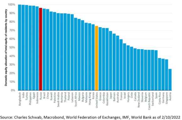 Ovviamente, la vulgata è quella di infliggere il maggior danno possibile al sistema di potere di Vladimir Putin e dei suoi amici oligarchi, i vicini di casa di Zelensky al Forte. Balle. Guardate questo grafico, il quale ci mostra plasticamente come il 95% degli investimenti dei russi sia basato su portfolios stracolmi di titoli azionari domestici.