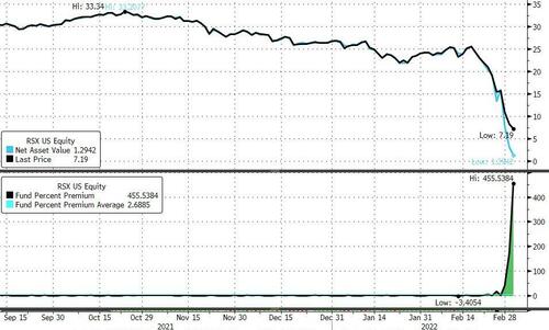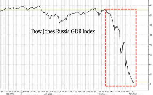 Tradotto, la Borsa di Mosca chiusa da lunedì e le valutazioni implicite dei titoli garantite da due proxies come l’ETF Van Eck e il GDR Index del Dow Jones, praticamente a zero e con cali attorno al 97% come mostrano i grafici, ci dicono una cosa sola: le menti sopraffine di Washington e Bruxelles con le loro scelte sanzionatorie mirate e draconiane per ora stanno polverizzando unicamente i risparmi di milioni di Igor e Irina, normalissimi cittadini russi – magari nemmeno troppo entusiasti di Vladimir Putin – la cui unica colpa è proprio quella di avere quella cittadinanza.
