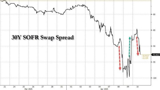 Nel frattempo, il basis trade è letteralmente esploso di nuovo nella notte fra giovedì e venerdì e con esso lo swap spread a 30 anni, di fatto l’indicatore più serio di stress di liquidità.