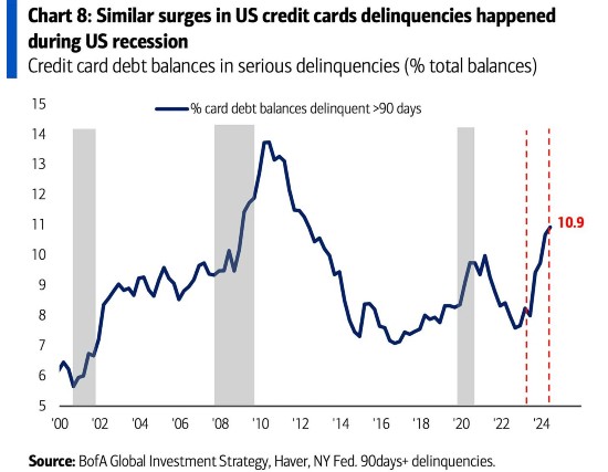 il quale ci mostra come il tasso di morosità serie su carte di credito negli USA sia a un livello record. E assolutamente in linea con un tendenziale da scenario recessivo. Non prospettico. Già in atto. Bene, parliamo della medesima America che vede il 57% delle detenzioni azionarie in mano a clientela retail. Pensate che siano in pochi a indebitarsi per giocare a Wall Street, debitamente imbambolati da media e irretiti da consulenti? Non vi sembra folle che nello stesso contesto si abbia una percentuale record di persone che saltano il RID della carta di credito, incorrendo in ovvie sanzioni e magari blocco dell’operatività, e un primato di clientela retail che si dissangua per negoziare titoli che rimanevano comunque carissimi anche dopo la correzione del 5 agosto? E che oggi, stante la ripresa record, sono il più delle volte nuovamente su valutazioni che fanno storcere il naso e attendere tempi migliori anche agli investitori istituzionali? Se sconfini sulla carta di credito significa che il tuo potere d’acquisto è devastato. Perché ormai quel pezzetto di plastica è una cambiale elettronica, utilizzata per evitare di sborsare ed erogare subito contanti. “Ci penserò il 15 del mese prossimo”. Ma quando arriva, il tuo potere d’acquisto è sempre lo stesso. E i guai come i debiti, semplicemente si accumulano. Non spariscono con la sterilizzazione o con l’helicopter money.