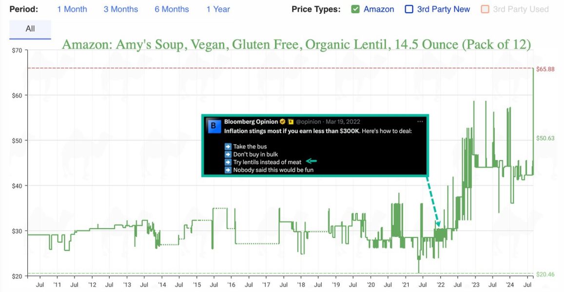il quale mostra il trend di prezzo di una confezione da 12 lattine di lenticchie nei principali centri commerciali statunitensi. “La carne dei poveri” come la sia chiamava una volta. E poi date un’occhiata alle scritte contenute nel grafico, le quali fanno riferimento a un articolo pubblicato da Bloomberg il 19 marzo 2022 e nel quale si offrivano consigli di sopravvivenza all’inflazione per cittadini con reddito inferiore ai 300mila dollari, i più colpiti dal carovita. “Prendi l’autobus, evita acquisti in grande quantità, prova le lenticchie al posto della carne e prendi atto che non sarà divertente”. Nulla che vinca il Nobel. In realtà, idiozie. Perché allora ne parliamo? Lo mostra il grafico. Da quando è stata pubblicata questa perla di economia domestica, guardate la tendenza del prezzo medio di quella confezione da 12 lattine di lenticchie. L’inflazione reale è questa. Quella che colpisce senza pietà persino i succedanei di sopravvivenza.