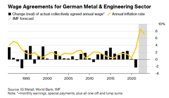 Certo, l’attenzione dei media è catturata dalla raccolta del Btp Italia, 5 miliardi nei primi due giorni che fanno ben sperare. Ma siamo sinceri, quell’emissione non si basa su un attestato di fiducia nel Paese e nel suo grado di resilienza economica. Bensì è poco più che una puntata al Superenalotto: si spera, tafazzianamente, che l’inflazione scenda talmente lentamente da garantire una succulenta cedola, stante appunto il carattere di legame diretto alle dinamiche dei prezzi di quel bond. Un grande Paese non ragiona così, siamo sinceri. In Germania, l’IG Metall è ai ferri corti con gli imprenditori, perché per i 3,9 milioni di lavoratori interessati dal rinnovo contrattuale chiede aumenti del 4,5-5% e, soprattutto, il passaggio dell’assegno familiare da 300 a 750 euro per lavoratore all’anno. Questo grafico descrive meglio di mille parole il livello di aumento contrattuale di cui si sta discutendo, correlandolo all’andamento dell’inflazione.