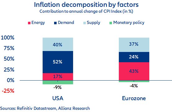 Signori, guardate questo grafico: ci mostra la scomposizione dell’inflazione di Usa e Ue per fattori. Come potete notare, una differenza balza subito all’occhio ed è quella rappresentata dall’area in blu scuro.