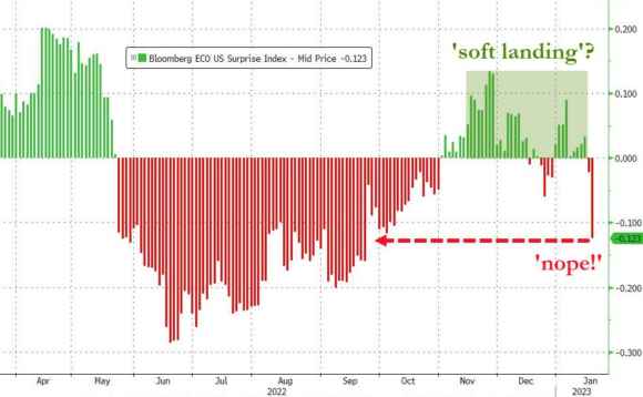 Qualche giorno fa, un grande quotidiano italiano dedicava l’approfondimento economico della sua firma di punta all’ipotesi di soft landing per l’economia Usa. Ovvero, evitare la recessione grazie a un atterraggio morbido dalle vette dell’inflazione, ora in apparente calo dai massimi. Bene, questo grafico rappresenta il quadro composito dei dati industriali statunitensi pubblicati mercoledì e raccolti nell’indice delle cosiddette sorprese economiche di Bloomberg.