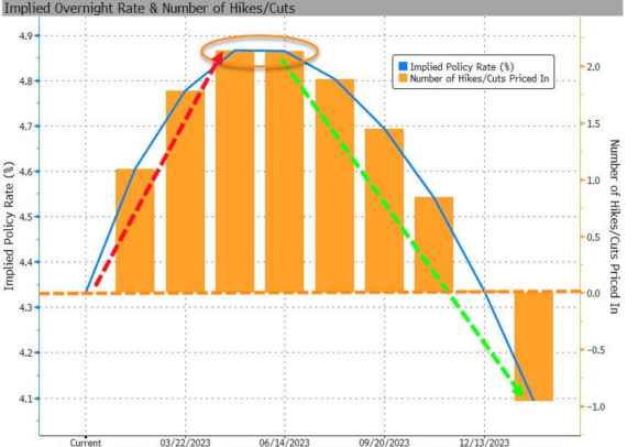 Un bagno di sangue, per tutte le voci, dalla produzione industriale alle scorte all’utilizzazione di capacity. Insomma, la realtà pare voler smentire l’aspettativa. O, forse, il wishful thinking auto-alimentante. Lo stesso che, ad esempio, sempre mercoledì ha visto lo spread fra Btp e Bund decennali scendere a piombo in area 170 punti base. Tutti prezzano Banche centrali meno aggressive. E se il nostro differenziale sembra incorporare nel suo premio di rischio un aumento di 50 punti base a febbraio e poi uno stop, ecco che questo altro grafico mostra come, nonostante il massacro macro appena andato in onda, il mercato dei futures sconti una Fed che metta in pausa i rialzi da maggio e che, soprattutto, subito dopo cominci un massiccio ciclo di tagli al costo del denaro. Un vero e proprio pivot.