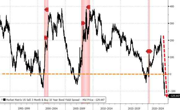 E la ragione sta tutta in questo ultimo grafico, poiché la curva dei rendimenti più sensibile ai timori di recessione, quella fra carta a 3 mesi e 10 anni, oggi è al massimo record dell’inversione, addirittura 130 punti base!
