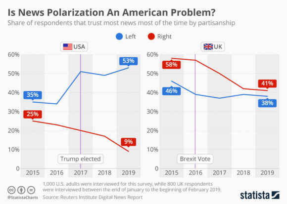 E il secondo grafico ci mostra come il capolavoro dell’amministrazione Trump sia totale, visto che la polarizzazione all’interno dell’opinione pubblica americana non è mai stato tanto ampio, rispetto alla percezione delle realtà, intesa come comunicazione delle notizie da parte dei media. Come vedete, nella Gran Bretagna post-Brexit, altro palcoscenico da Oscar delle fake news in serie, il gap nella percezione fra elettori/cittadini di destra e sinistra si è ristretto, dopo la Santabarbara di idiozie ideologiche spuntate come funghi prima e dopo il referendum. Negli Usa invece no, la divaricazione è cresciuta. Polarizzazione totale: i Democratici credono ai media, i Repubblicani li ritengono invece come il loro Presidente li descrive ogni giorno nei tweets. Dei falsari di verità, spacciatori di fake news.