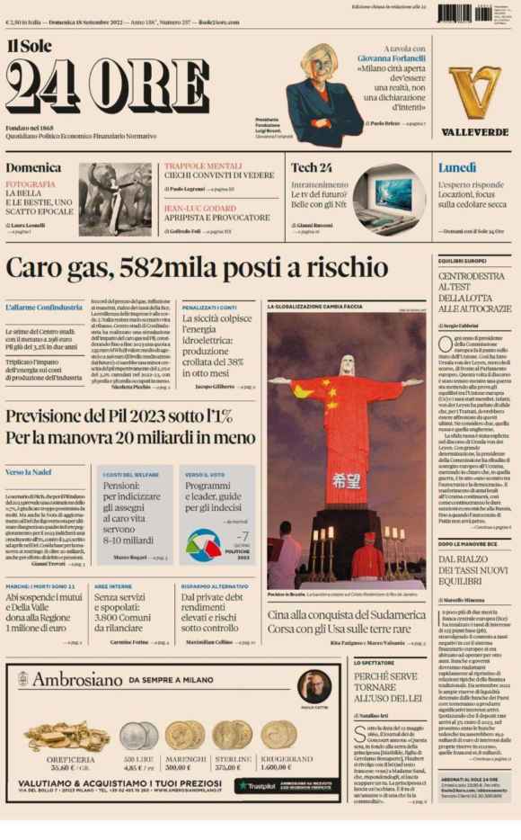 Nel primo caso conta il titolo di apertura, nel secondo il cosiddetto titolo di soppalco. Ma l’argomento è identico: il report di Confindustria, altra organizzazione certamente non eversiva o prezzolata dal Cremlino, riguardo l’impatto della crisi energetica sull’economia italiana. Parlano i titoli: rischio di fabbriche ferme entro Natale per mancanza di metano e costi insostenibili, 582.000 posti di lavoro a rischio e, soprattutto, un impatto potenziale e in negativo sul Pil del 2023 di qualcosa come il 3,2% a causa del caro-energia. Avete sentito qualche tg o talk elettorale parlare diffusamente di questo domenica?
