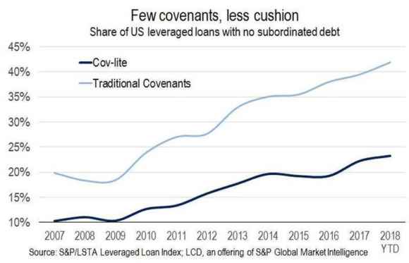 Primo, la disconnessione sempre più palese e stridente fra fondamentali e prezzi degli assets resa possibile dalla costante manipolazione dei mercati posta in essere dalla Fed. Secondo, il livello record di stratificazione di debito su debito da parte delle aziende, la maggior parte del quale cartolarizzato per meglio mischiare le carte e confondere gli investitori meno attenti. Terzo, il sonno dei regolatori di fronte al fenomeno degli accordi covenant-lite che, mano a mano, hanno tolto sempre più garanzie e protezione agli investitori. I quali, oggi, pagano un prezzo doppio alla crisi, partendo da un presupposto di affarone che pensavano di avere fatto soltanto pochi anni o trimestri fa, acquistando quei bond retti da esotiche formule che garantivano rendimenti più alti della media. E quest’ultima dinamica appare la più inquietante, in prospettiva. Questo grafico mostra plasticamente l’avvento e la crescita dei cosiddetti covenant-lite nell’universo dei leveraged loans statunitensi senza debito subordinato.