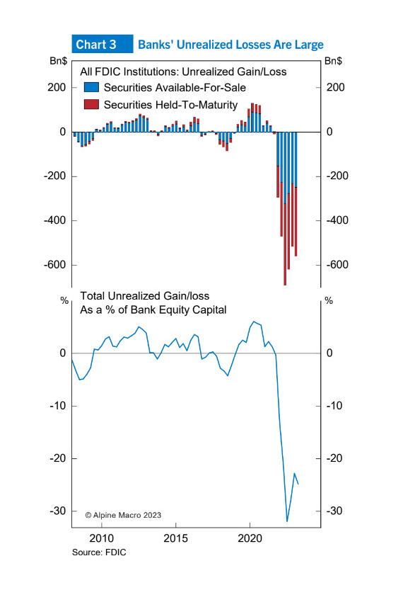 Date un’occhiata al grafico: sulla testa delle banche Usa oggi gravano circa 600 miliardi di unrealized losses. Ovvero, perdite legate al valore di assets iscritti a bilancio. E non ancora scontate alla realtà ma al mark-to-Qe.