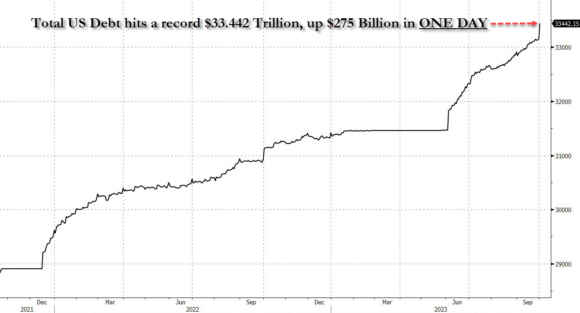 Ora, date un’occhiata a questo grafico. I medesimi Usa hanno aggiunto al loro fardello 275 miliardi di nuovo debito in un solo giorno. A oggi, il computo è di 33,442 trilioni di dollari. Solo due settimane fa era stato varcato il Rubicone dei 33 trilioni. E oggi la realtà è quella di uno stock che pare destinato a crescere di 1 trilione al mese.