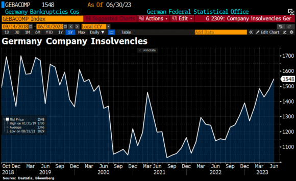 Le insolvenze corporate in Germania stanno esplodendo. A giugno, 1.548 aziende hanno alzato bandiera bianca. Bancarotta. Un sobrio +36% su base annua. E prendendo il dato a livello semestrale, la prima metà dell’anno ha segnato quota 8.571. Rispetto allo stesso periodo del 2022, +20,5%. Chiaramente si tratta di PMI. E il ragionamento che sorge spontaneo è il seguente: la fornitura e subfornitura italiana all’economia teutonica è indirizzata principalmente alle grandi ditte, ai marchi prestigiosi come quelli automobilistici. O dell’industria pesante. C’è un problema, di fondo. Quelle PMI andate a zampe all’aria come mosche dopo una passata di insetticida, perché sono crollate?
