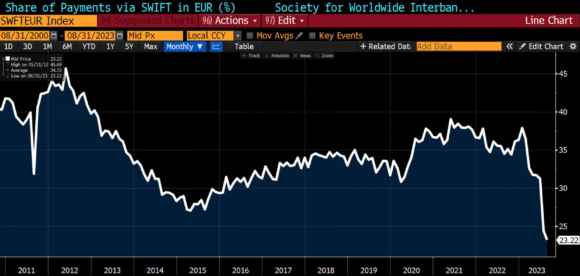 E Bruxelles pare del tutto inconsapevole, basti dare un’occhiata al cross valutario. Nella testa di Commissione e Bce, solo due priorità: Ucraina e inflazione. Et voilà, l’euro crolla nella sua quota di utilizzo Swift. Di cui ci si è occupati solo per tagliare fuori le transazioni russe e ottenere il congelamento di riserve della Banca centrale.