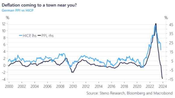L’ultimo dato relativo ai prezzi alla produzione tedeschi parla chiaro: -14,7% su base annua, un trend deflazionistico che sta prendendo rapidamente abbrivio. La palla di neve, appunto. Con la quale, probabilmente Christine Lagarde pensa di poter giocare. Attendendola però a fondo valle. Mai da quando sono cominciate le serie statistiche, ovvero dal 1949, si era assistito a un calo così repentino e drastico. Ed ecco quindi che Steno Research decide di intitolare così il suo ultimo grafico su elaborazione Macrobond: la deflazione, esattamente come certi circhi itineranti di tanti anni fa, sta forse per approdare vicino a te?