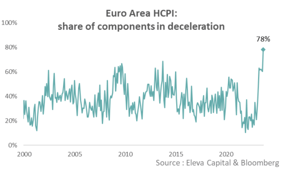 E quest’altro grafico rafforza questo timore prospettico. Sono infatti il 78% del totale le componenti dell’inflazione nell’eurozona che stanno vivendo un trend di netta decelerazione, stando al dato CPI europeo reso noto giovedì. Una percentuale anche in questo caso record, senza precedenti nelle serie storiche.