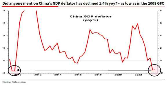 Detta così, probabilmente nessuno si stupisce. Il fatto che in Cina il cooking the books macro sia una specialità della casa, è noto. Cosa fa drizzare le antenne al permabear? Il fatto che, forse, il deflatore dica la verità. E il dubbio sorge dalla dinamica rappresentata in questo secondo grafico.