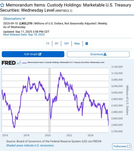 I grafici parlano chiaro: i livelli di riserve cash delle banche estere (non Usa) sono letteralmente crollati nelle ultime due settimane. Un calo di 225 miliardi. Quando vi dicevo che la Bank of Japan e la Bank of England stavano dando vita a ogni genere di manipolazione per non fare implodere i loro mercati obbligazionari, vi raccontavo bugie? Esagerazioni catastrofistiche? Parlano le cifre, adesso. E quelle del secondo grafico sono ancora più esplicite, poiché ci mostrano come il livello di securities governative Usa negoziabili (leggi, collaterale per qualsiasi operazione finanziaria) detenute presso la Fed, la scorsa settimana fosse calato al minimo da 10 anni a questa parte. Ovvero, fame. Fame di collaterale. Fame di liquidità. Extra-Usa.