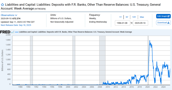 Ciò che vedete è il livello di refill del Tga raggiunto al 10 settembre scorso. Come leggete, oggi ci sarà l’aggiornamento. Siamo a quota 672,27 miliardi ottenuti tramite le mega-emissioni di titoli a breve termine messe in cantiere da Scott Bessent con il suo raddoppio dei controvalori delle aste nel terzo e quarto trimestre. Solo lunedì, oltre 155 miliardi in Bills a 3 e 6 mesi. Nel periodo luglio-settembre, oltre 1 trilione in nuovi titoli. Da ottobre a fine anno, altri 560 miliardi.