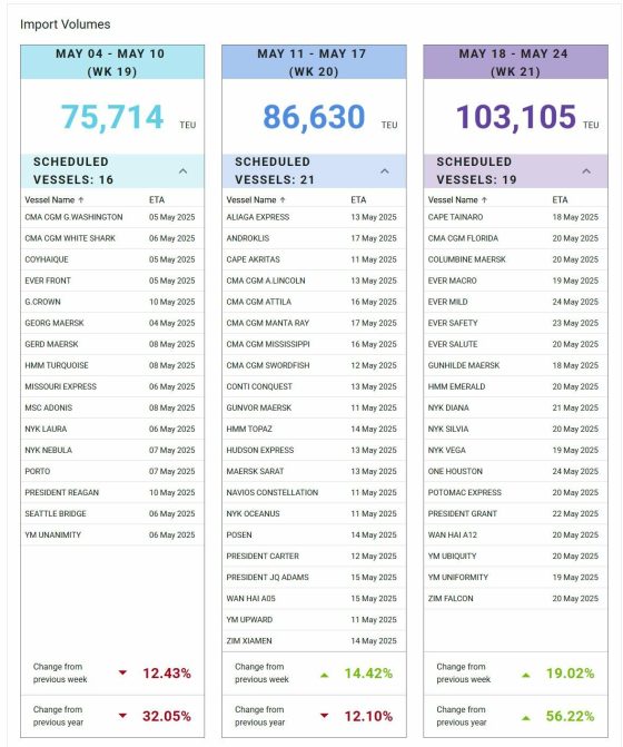 E basta dare un’occhiata a uno strumento freddamente contabile come il Port Optimizer del porto di Los Angeles per scoprire che, in base ai noli e alle prenotazioni, il volume di importazioni dalla Cina nella settimana fra il 18 e il 24 maggio sono attesi in aumento del 19% rispetto alla settimana precedente. E addirittura del 56% rispetto al medesimo periodo del 2024.