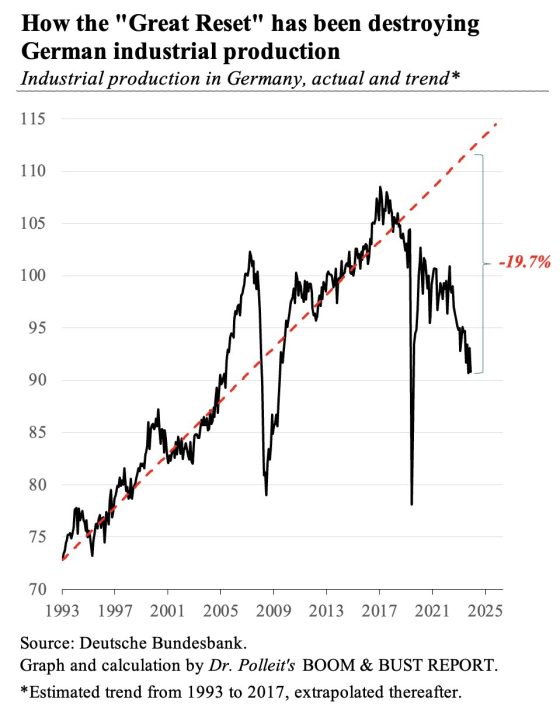 Il grande reset cominciato con le multe per le emissioni truccate comminate dalle autorità Usa ai colossi automobilistici tedeschi, passato per il boccone avvelenato dell’acquisizione di Monsanto da parte di Bayer e tramutatasi in una trappola di ulteriori cause miliardarie per diserbanti cancerogeni e culminato prima nel lockdown pandemico e poi nella mortale agenda green e nelle sanzioni alla Russia hanno devastato il modello industriale tedesco. La Germania ha di fronte a sé un processo di ricostruzione che rende quello post-Riunificazione una passeggiata nel parco. Quante nostre PMI dipendono dall’interscambio con la Germania, il quale ha già perso un 7% quest’anno rispetto al 2023?