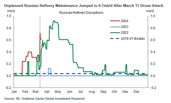 Infine, ecco che quest’altro grafico ci mostra appunto come l’offensiva ucraina dei droni contro le raffinerie russe abbia costretto queste ultime a blocchi per manutenzione imprevisti. Facendo precipitare l’export russo di diesel.