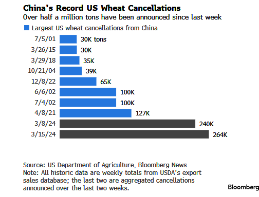 Il grafico mostra il livello record di cancellazioni di carichi di grano statunitense da parte delle autorità cinesi: solo la scorsa settimana, oltre mezzo milione di tonnellate. Come si nota, livelli mai toccati nella serie storica tracciata dall’Usda. E i futures sul grano trattati a Chicago hanno patito il colpo.