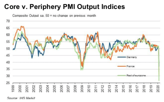 L’IHS Euro Zone Composite PMI è infatti crollato al minimo storico di 31.4 contro il 51.6 di febbraio: praticamente, un massacro. E attenzione, perché quel dato preliminare si basa sostanzialmente su stime, relative soprattutto alle letture già giunte da Germania e Francia. Italia e Spagna, ad esempio, forniranno le stime PMI fra l’1 e il 3 aprile prossimi: se per caso – e tutto ci porta a pensare che sarà così, per stessa ammissione di Governo e Confindustria – questa prospettiva sarà confermata, per le due economie principali della cosiddetta Europa periferica si tratterà di un tracollo ben peggiore di quello registrato durante la grande crisi finanziaria del 2008-2009. E anche di quello del 2011, quando l’Italia fu costretta all’opzione emergenziale del Governo Monti e l’intera eurozona affrontò il più duro test sulla sua tenuta dall’introduzione della moneta unica.