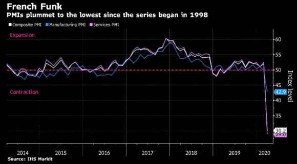 A mostrare la resistenza più dura è stata finora l’Olanda, apparentemente nemico non invincibile. Ma tutti sanno che se L’Aja parla è perché Berlino ha dato il via libera. E perché la Germania sarebbe intenzionata a mettere dei silenziosi paletti, pur agendo attraverso il proxy “arancione”? Ce lo mostra questo secondo grafico, dal quale si evince lo stato di salute della Francia: l’indice PMI manifatturiero è sceso a marzo a 42.9 dal 49.8 di febbraio, ma, soprattutto, quello dei servizi si è letteralmente schiantato al minimo storico di 29.0 dal precedente 52.5. Trattasi del classico regolamento dei conti in seno all’asse renano che fu, la vendetta fredda che Angela Merkel sta prendendosi su Emmanuel Macron dopo mesi e mesi di iperattivismo dell’Eliseo per strappare a Berlino lo scettro di locomotiva economica e, soprattutto, referente politico unico dell’Europa verso il resto del mondo.