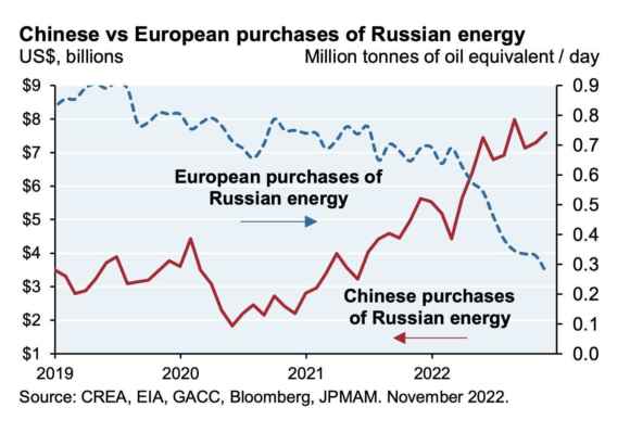 Domanda: perché Mosca può (e vuole) azzardare determinate mosse, forse sente la sconfitta sempre più vicina? Tutt’altro. Perché l’Europa ha regalato ufficialmente la Russia all’influenza cinese. Anzi, qualcosina di più: alla dipendenza cinese. Questa immagine è stata elaborata da JP Morgan su dati ufficiali: di fatto, Pechino ha già riassorbito tutti gli acquisti energetici russi che il Vecchio continente ha abbandonato in nome delle sanzioni e dell’affrancamento dal giogo di Mosca.