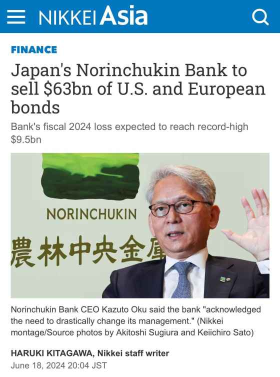 E cosa ci dice? Che il detonatore di guai potrebbe essere pronto. La banca cooperativa di pescatori e agricoltori giapponesi – la stessa di cui vi ho parlato alcune settimane fa, sottolineando la necessità di raccogliere almeno 7 miliardi di dollari per tamponare le perdite su investimenti a reddito fisso andati nella direzione sbagliata – ha comunicato che per cercare di salvare il salvabile, farà spazio nei registri. Per l’esattezza, scaricherà 63 miliardi di dollari di titoli di Stato statunitensi ed europei.