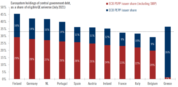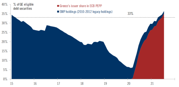 La Grecia ha appena superato il limite del 33% per emittente e, a occhio e croce, continuerà strutturalmente su quella linea di violazione sistematica. D’altronde, il debito in seno al Pepp è da considerarsi de-consolidato, quindi in punta di regolamenti ci si può tranquillamente trincerare dietro cavilli e postille. Per quanto, però? Per quanto può durare la danza macabra del Covid che ciclicamente torna a togliere le castagne dal fuoco di Banche centrali e governi, permettendo ancora un po’ di metadone di Stato sotto forma di monetizzazione del debito e finanziamento diretto dei deficit?